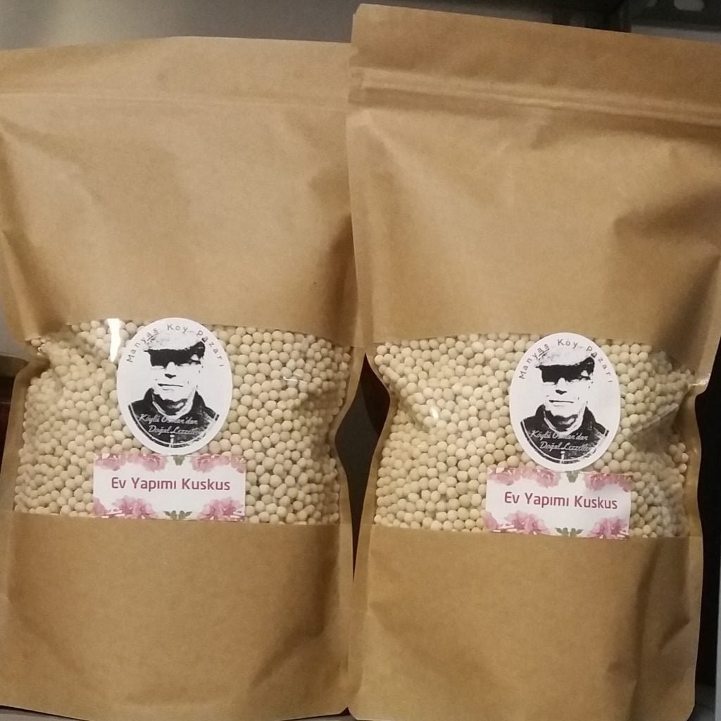 El emeği, göz nuru olan bir üründür. Kuskus, küçük bulgur tanelerinin, köy yumurtası, köy sütü ve un ile kaplanmış halidir. Kuskus teknesinde bu malzemeler sürekli karıştırılır. Sonra oluşan kuskus taneleri kevgirde sallanarak istenilen boyuttakiler ayrılır; tüm bulgur taneleri kaplanıp istenilen büyüklüğe gelene kadar işleme devam edilir.Kullandığımız un, Manyas civarında yetişen yerli buğdaylardan elde edilmektedir.Sağlıklı, lezzetli ve besleyici olan bu ürünümüze çocuklarınıza güvenle yedirebilirsiniz.